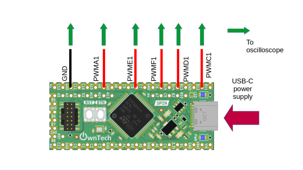 Connect the SPIN board to your USB and upload the code. You can set dead time, phase shift, frequency and duty cycle.